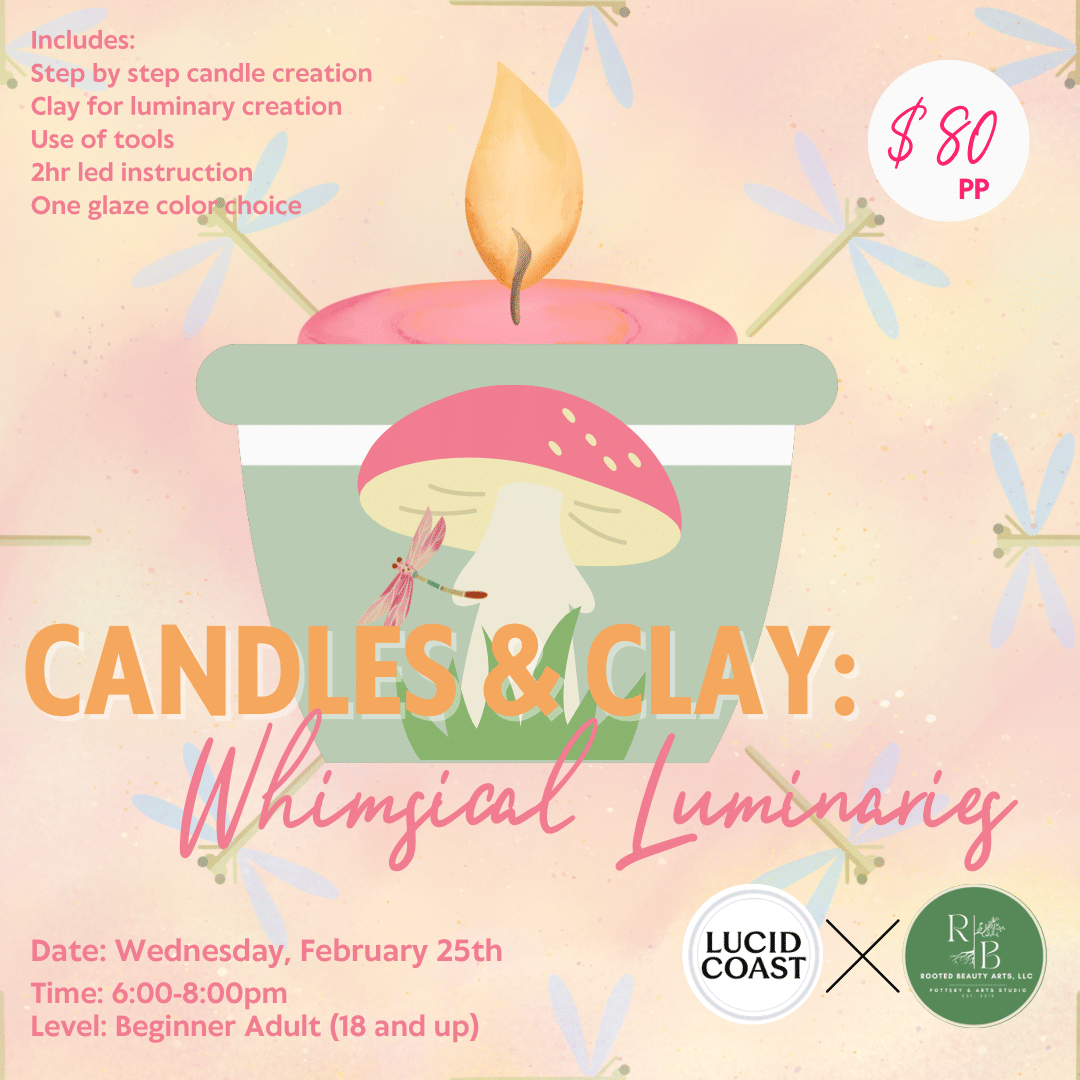 Rooted Beauty Pottery will guide you through making you luminaire, while Lucid Coast walks you through the candle making process. No experience needed. Just come create something that actually feels intentional.